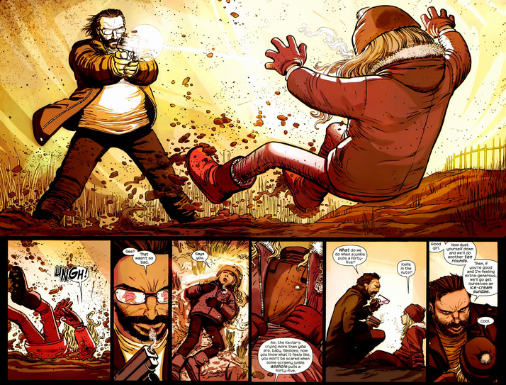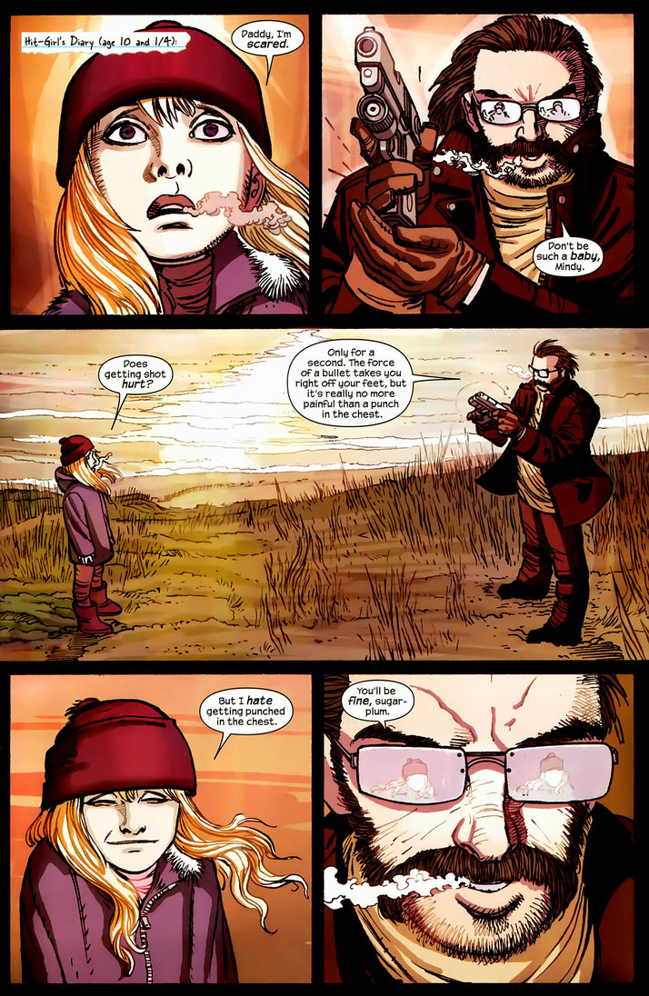 Vaughn goes with closeups just as Romita and Millar do in the comic book, but he increases the distance between Hit Girl and Big Daddy by mixing in longer and wider shots perhaps to make the scene, where a bulletproof vest must stop a bullet, look more realistic. The change also serves to emphasize the distance between the two in their relationship as handler and programmed, mind-controlled asset, providing the scene with a colder, more disturbing feel. Regardless of the motivations, this is a classic example of an effective piece of comic book adaptation and it was the standing ovation that this scene received in front of a crowd of 6,500 at Comic-Con that helped convince Lionsgate to open their wallet up to acquire Kick-Ass.
